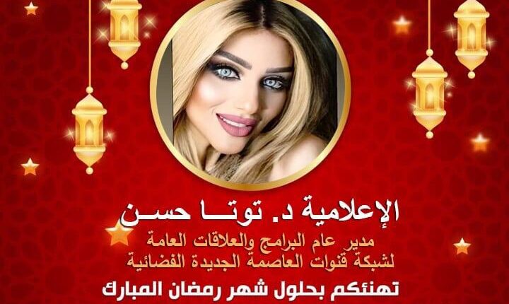 الاعلامية د . توتا حسن تتقدم بأرق التهاني والتبريكات لكافة اصدقائها ومشاهديها ومتابعيها بمناسبة حلول شهر رمضان الكريم أعادة الله عليكم وعلى الأمة الإسلامية بالخير واليمن والبركات .