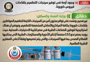 تداولت بعض وسائل الإعلام والمواقع الإلكترونية وصفحات التواصل الاجتماعي أنباء بشأن وجود أزمة في توفير سرنجات التطعيم بلقاحات فيروس كورونا، وقد قام المركز الإعلامي لمجلس الوزراء بالتواصل مع وزارة الصحة والسكان، والتي نفت تلك الأنباء، مُؤكدةً أنه لا صحة لوجود أي أزمة في توفير سرنجات التطعيم بلقاحات فيروس كورونا، مُشددةً على توافر مخزون آمن من السرنجات اللازمة لتطعيم المواطنين بلقاحات كورونا بكافة المراكز والأماكن المخصصة للتطعيم، مُوضحةً أن هناك استراتيجية لتوطين الصناعات الطبية في مصر لتلبية الاحتياجات المحلية، حيث يوجد بمصر نحو 152مصنعاً لإنتاج الأدوية والمستلزمات الطبية التي يحتاجها القطاع الصحي بما فيها السرنجات، والتي يتم تصنيعها وفقاً لأعلى المعايير الطبية العالمية.