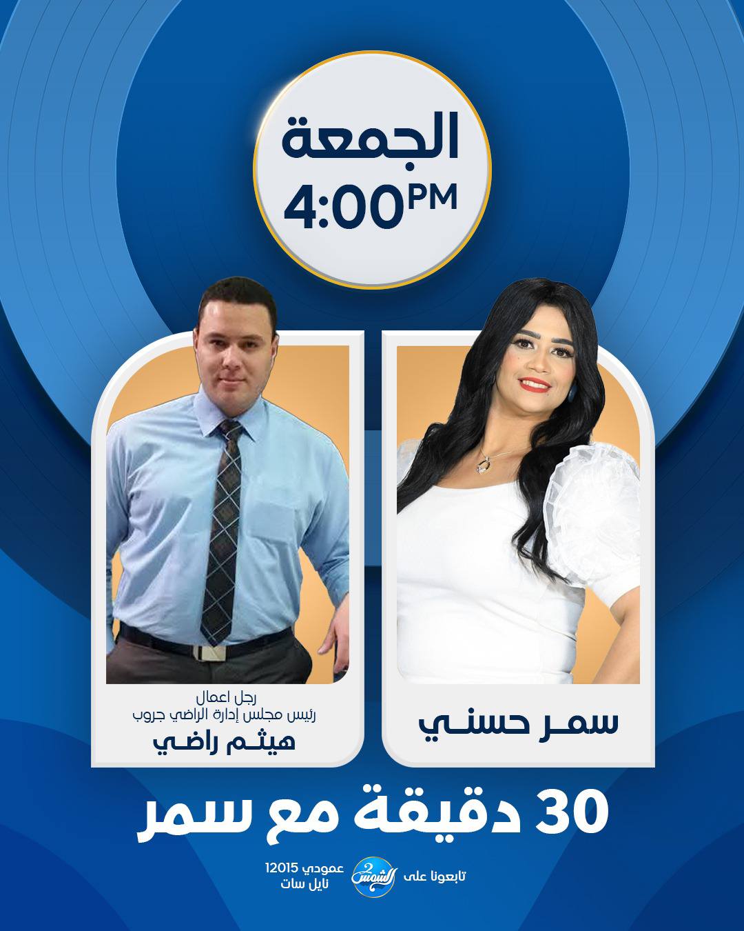 تطل الإعلامية سمر حسني على جمهورها في حلقة جديدة من برنامجها المميز “30 دقيقة مع سمر” عبر شاشة قناة الشمس الزرقا يوم الجمعة في تمام الساعة 4:00 مساءً.