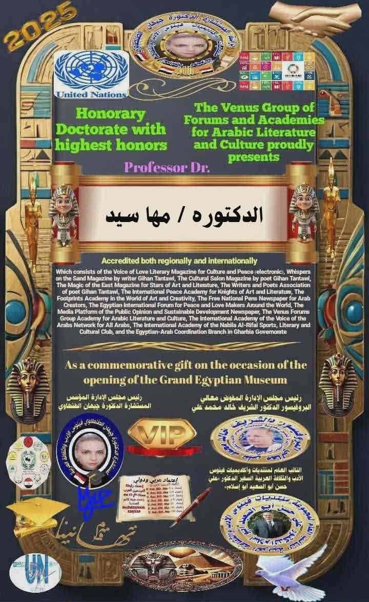 في إطار احتفالاته السنوية، أعلن ملتقى فينوس للأدب عن منح الدكتورة الفاضلة مها سيد الدكتوراه الفخرية تقديرًا لجهودها الفعالة وإسهاماتها المتميزة في خدمة الأدب والثقافة خلال عام 2025.